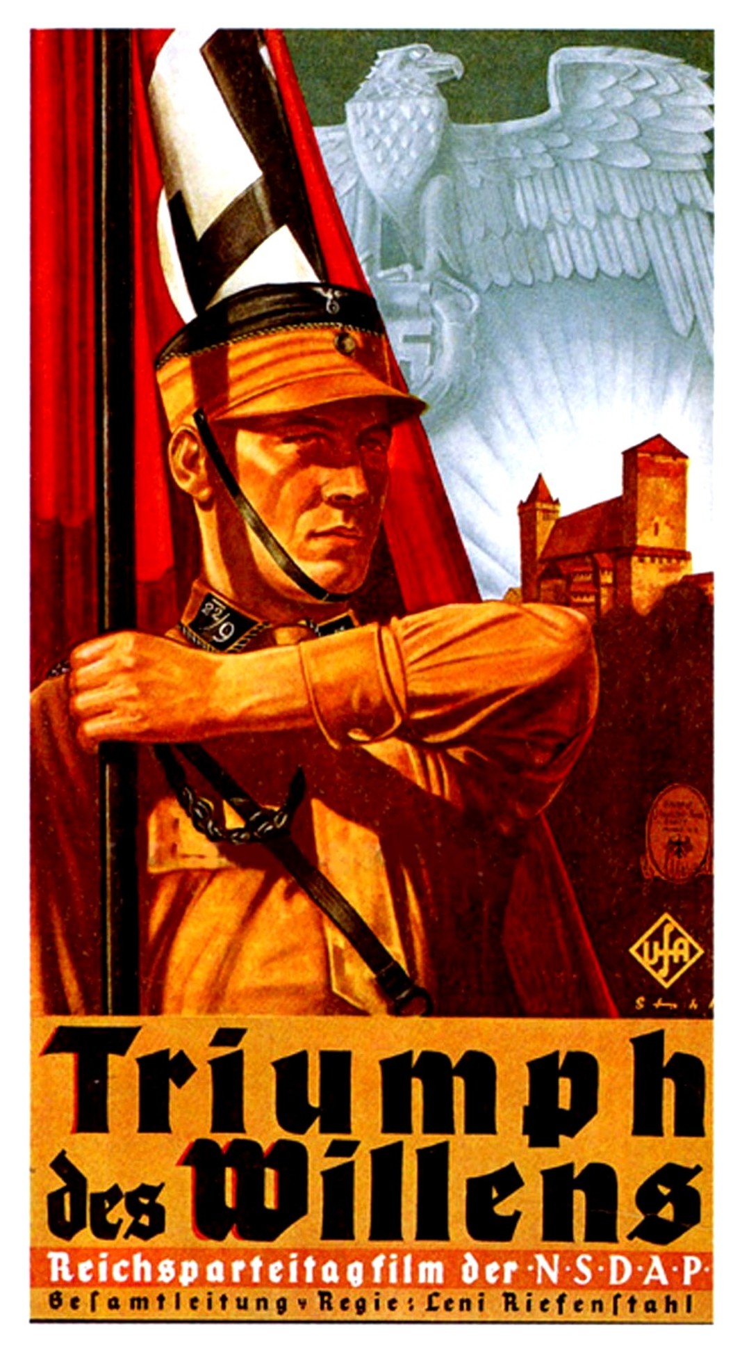 | Synopsis : « Chef d’œuvre de haine, de vanité provocante, d’orgueil démoniaque, mais chef-d’œuvre tout de même. » – Riefenstahl utilise le langage cinématographique pour glorifier et mythifier le sujet : contre-plongées héroïques, contre-champ nombreux de spectateurs (soldats, militants et « civils ») enthousiastes. Le cadrage de la foule, lors de travellings ne permet pas un décompte exact. Travellings circulaires lors des discours et très grands plans lors des parades. – La séquence d’ouverture fait d’Hitler un dieu descendu des cieux pour sauver le peuple allemand. « Un dieu nouveau descendant du Walhalla », selon Mitry qui reprend l’analyse de Sadoul:(« L’avion du nouveau Messie se posait à Nuremberg. ») qui, plus loin, parle de « pompeuse déification wagnérienne ». Ferro évoque « l’avion du Führer qui descend du ciel tel le démiurge » | |
